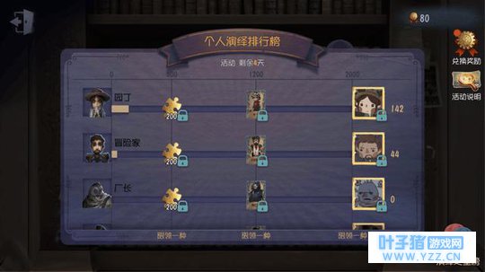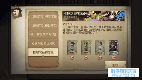 4.推理之径第一赛季的活动,当玩家的推理之径达到指定的格数之后,可以获得时装。100格-医生的清雅白、308格-园丁的金秋黄、1218格-空军的象牙白、1500格-魔术师的白金阿拉丁。这四款时装都不错,其中属白金阿拉丁最好看。