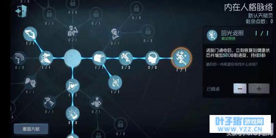 2、有时候队友什么都没干,忽然就从受伤的状态变成了满血,让人百思不得其解。实际上这是因为队友点了“回光返照”的人格,在修完最后一个电机之后就能直接回复成满状态。这个人格还是在开黑的时候作用比较大,可以先让一个队友压电机,配合20秒无敌的“化险为夷”,再解开最后一台电机,这样即使屠夫“一刀斩”也能逃脱。
