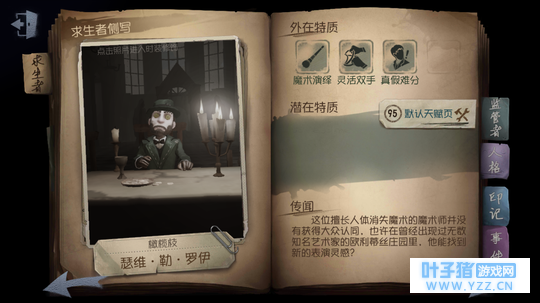 上等人 医生出生优越,身娇体贵,其板窗交互速度均降低 15% 。 相比律师医生这个角色更偏辅助型一些,医生携带的道具是针,相当于一个移动医疗站。这里要注意的是,医生用针治疗自己活着别人是不会消耗道具的。而推荐医生的原因也正是这个,只要能够甩掉屠夫的追捕,就相当于是无线续命了。另外值得注意的是在自己治疗别人速度提高的同时,全队队友治疗也提高了5%。 NO.3 魔术师 推荐指数:★★★☆ 上手难度: ★ ★ ☆