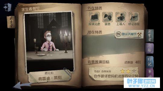 深谋远虑:(主动技能) 随身携带地图,使用地图能显示一定范围内随机一台密码机的位置。良好的阅读习惯让他在使用地图时不会产生消耗。