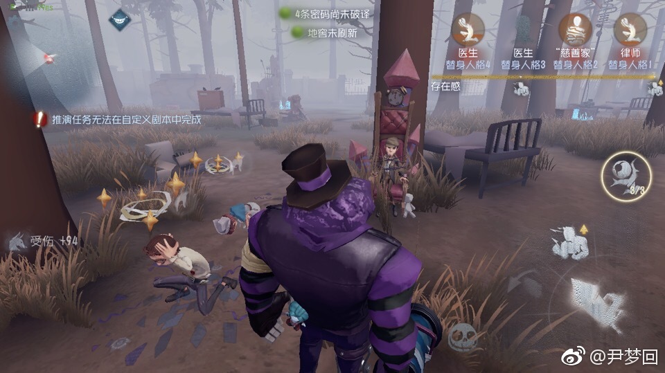 ●田忌赛马四个求生者,肯定有个最会玩的最强的。游戏是淘汰3个就胜利,抓住另外这3个就好了,最强的逃脱了也没事。现在抓住2个也行,平局不掉胜率排位还加分,再努力一下就好了~追求生者要稳,别着急攻击,等距离够了再攻击、蓄力攻击,要不然没打着又要追好久。熟悉熟悉蓄力攻击的距离,一击必中! 拉视野观察求生者行动,跑半天你走直线就好!刚开始地图加载慢的话,雾里有时隐约会有求生者轮廓~ 仔细看 ●与求生者斗法距离拉近后过窗、过板打到都是一刀倒!注意拉视野预判求生者走位,绕路拦截,给求生者惊喜。