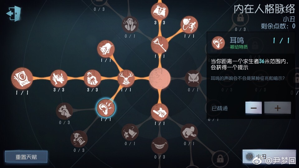 雷达带X电机为求生者炸鸡(触电) 耳鸣与窥伺各有千秋、各有利弊。耳鸣作用全局,缩小搜索范围,提前锁定求生者方向。窥伺侧重开门之前,近距离定位发现破译中的求生者。看个人喜好,实力较强的选择耳鸣较好~ ●好用特质技能:兴奋 巡视者 传送 闪现
