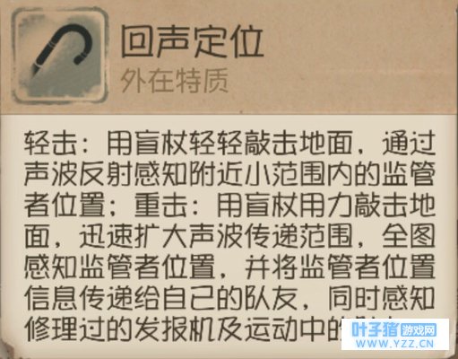 外在特质一:回声定位 盲女作为一个四周一片黑的人,到底怎么感受世界呢?当然是使用她的盲杖啦。这就是盲女的第一个特质——回声定位。分为被动技能轻击和主动技能重击。 在连续走路和跑步时盲女会自动触发轻击,可以看见周围小块区域,并且可在可见范围内隔墙透视屠夫,隐身的杰克也可以隔墙看的一清二楚,再也不用担心屠夫反绕啦!但蹲行、站立不动、上气球、上树以及修机时无法触发轻击,四周会陷入一片漆黑,此时一定要盯紧寒意哦。 使用小技巧:蹲行时不会触发小杖,如果有寒意或心跳却不知道监管者在哪,可以一直朝一个你觉得安全的小角落直走,也就是朝墙走,这样可以持续轻击又不容易被看到衣角发现行踪,当透视到屠夫后就可以开始躲猫猫等屠夫走啦。不过敲杖声音屠夫仔细听是可以听到的,但是极其微弱。另外不要靠红光辨认,盲女是看不清红光的。