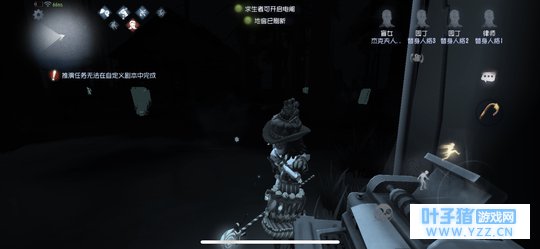 未使用回声定位时的视角,四周陷入一片漆黑,只能看见附近的板子和面前的密码机 主动技能重击无消耗有CD,发动后可以全队全图透视监管者、求生者10s,在这10s里自己还可以看到修理过的密码机以及大范围复明,期间小地图会显示屠夫方位,可以说是一个非常强势的技能了。大杖冷却CD50s。不过因为盲女是小瞎子,不能离开她的盲杖,所以不可以更换道具,翻箱子后不会出现交换选项。 使用小技巧:因为是个全队共享的技能,所以推荐开局敲杖报屠夫点。如果你不是溜屠流盲女,在看到屠夫位置后可以远离屠夫,安静偷电修机。在有寒意或心跳时敲杖可以知道屠夫位置,绕道离开苟起来,等他走了再回去安静偷电修机。被追时敲杖给队友报屠夫和自己的点,以及看看有没有队友愿意帮忙接一下快递,自己跑路安静修机。受伤时敲杖好寻找队友治疗自己,治好后安静偷电修机。溜屠流盲女敲杖可以直奔屠夫位置,让屠夫看到你bulingbuling的身影,调戏小屠屠。不过敲杖会有一秒的停顿,被屠夫追的太死时就不要敲杖啦。 因为盲女仇恨值很高,所以推荐大家还是善用这个技能苟着修机,可以修一些比较安全的机,危险的机最好交给队友去修,让屠夫整局见都见不到你。
