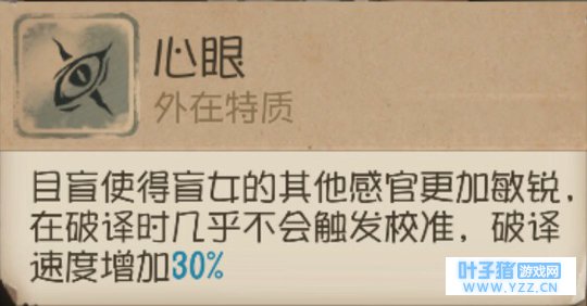 盲女的正面buff——心眼,增加30%修机速度,大幅度降低校准触发概率。