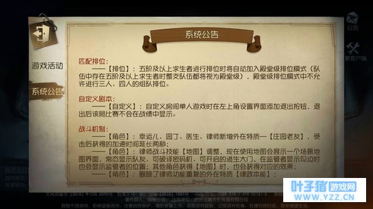 那我们再来看这个图共4个要点! 1丶也就是说5阶及5阶以上的人只能进行双排 变相的增强了一下屠夫吧 毕竟人皇车队是很烦的 2丶自定义可以退出了 嗯就是这样 3丶也就是说幸运儿 园丁 医生 律师 被屠夫砍了之后弹射起步比别的角色多两秒 4丶律师进行了一些技能的调整 地图的功能更多了仅此而已