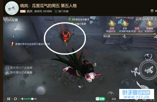 圈里就是一个缩小的空军和比空军都大的提示图标。看完你还玩冒险家吗? 红蝶在地下室飞天会怎么样?穿墙上天!就是这么无敌。 截图都是在熊猫主播的直播间里截的,他们几乎都有第五人格共研服的账号,开了自定义游戏专门研究红蝶。感兴趣的欢迎来熊猫直播—热门手游专区看主播们的抢先体验哦!