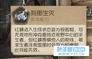 是不是没看懂啊?我来解释下: 三相之身:附近没人走得快;攻击求生者以及被求生者面对面盯着时移速变慢。看好了,是面对面哦,你的肚脐眼朝向不是你的头朝向。 刹那生灭:红蝶飞天后如果视野中出现求生者,会立即直线朝求生者飞过去。但如果求生者肚脐眼对着你,你的飞行过程会被立即打断。
