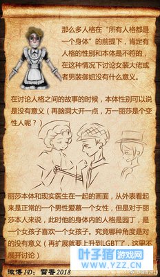 丽莎本体性别认为是男是病例上写的,在这个世界能相信的只有实物证据,而这个时代是不会因为人格认为自己是男就给病例上写性别男的——综上所述推测丽莎是男性。 但是园丁人格是女性也是毋庸置疑的。 本文来源:bilibili,作者:liege小L,转载请注明来源。 |