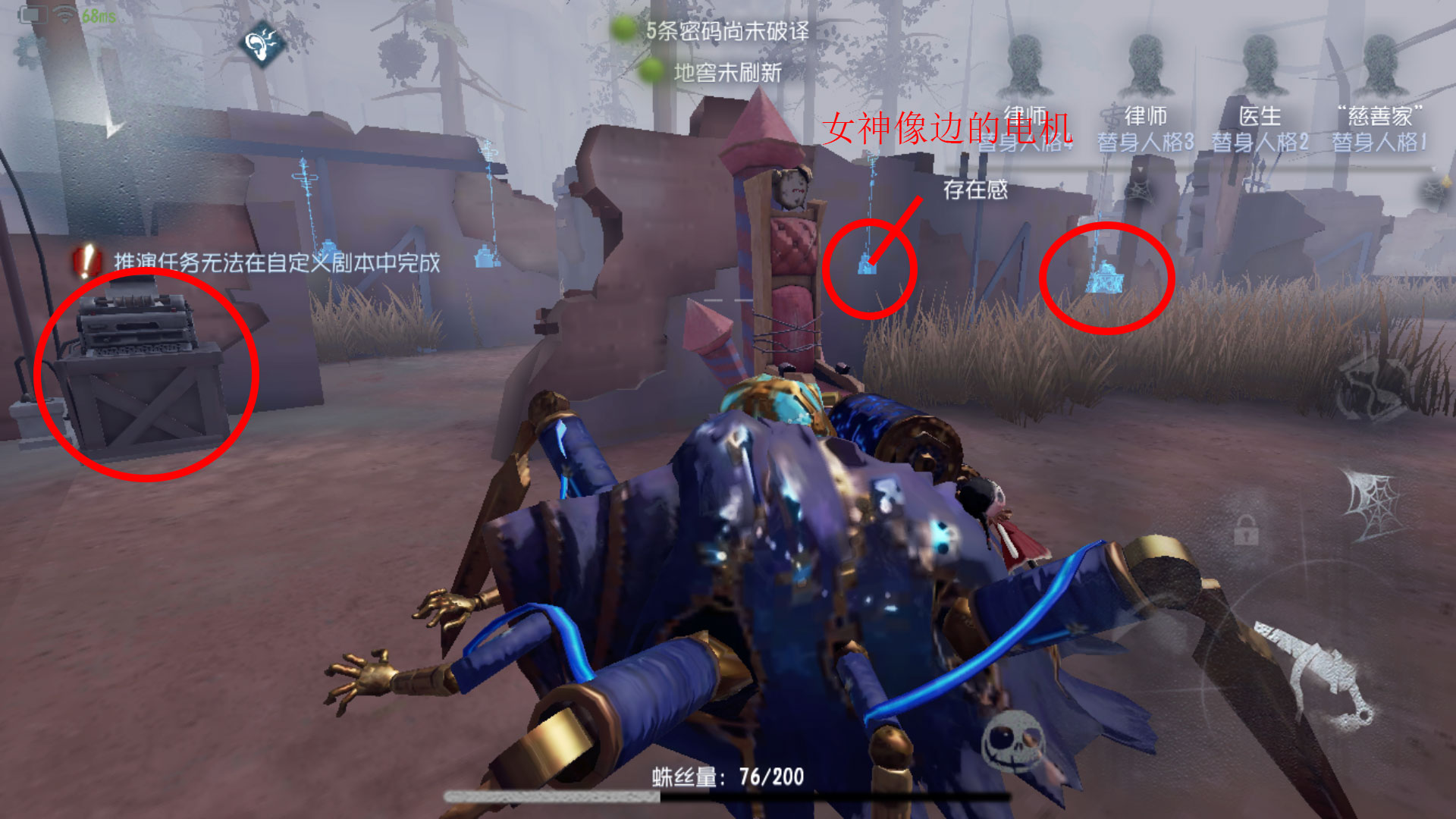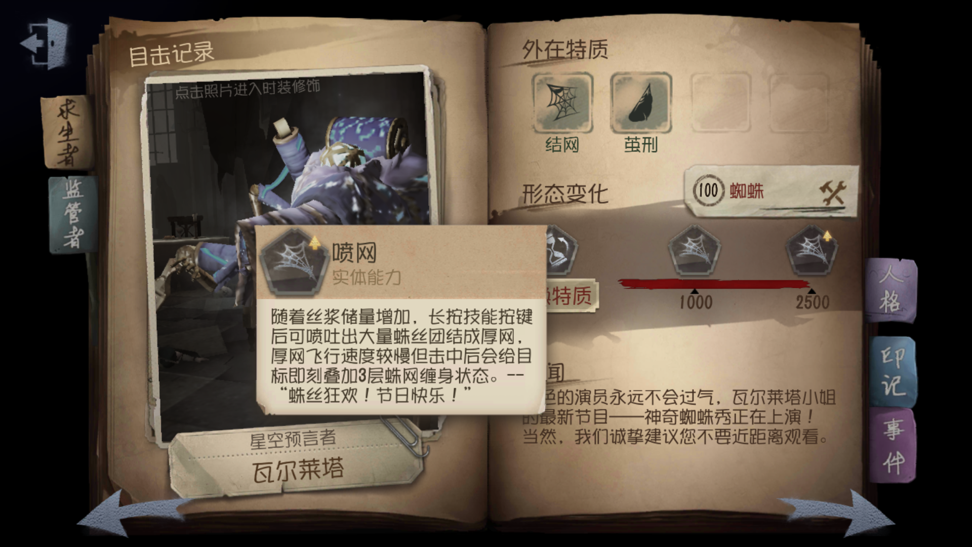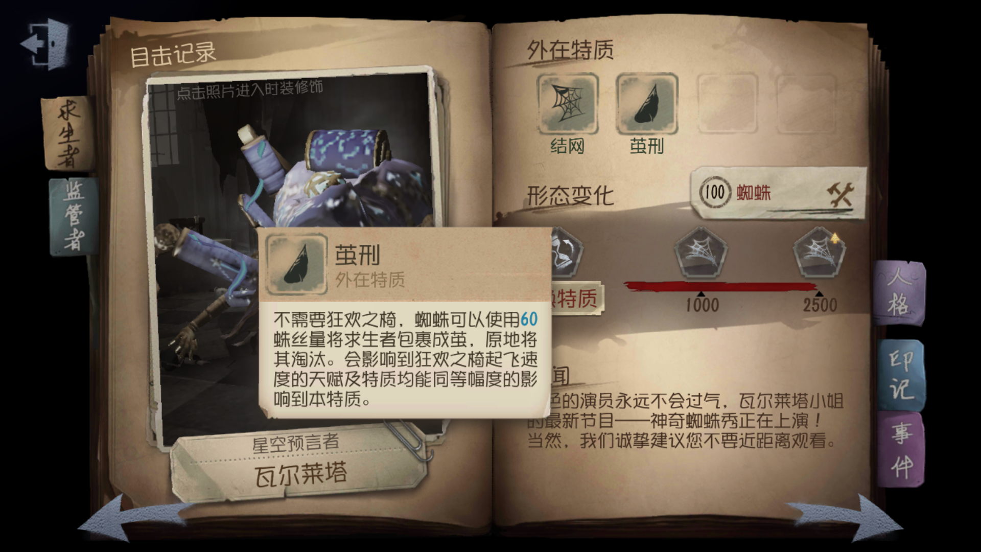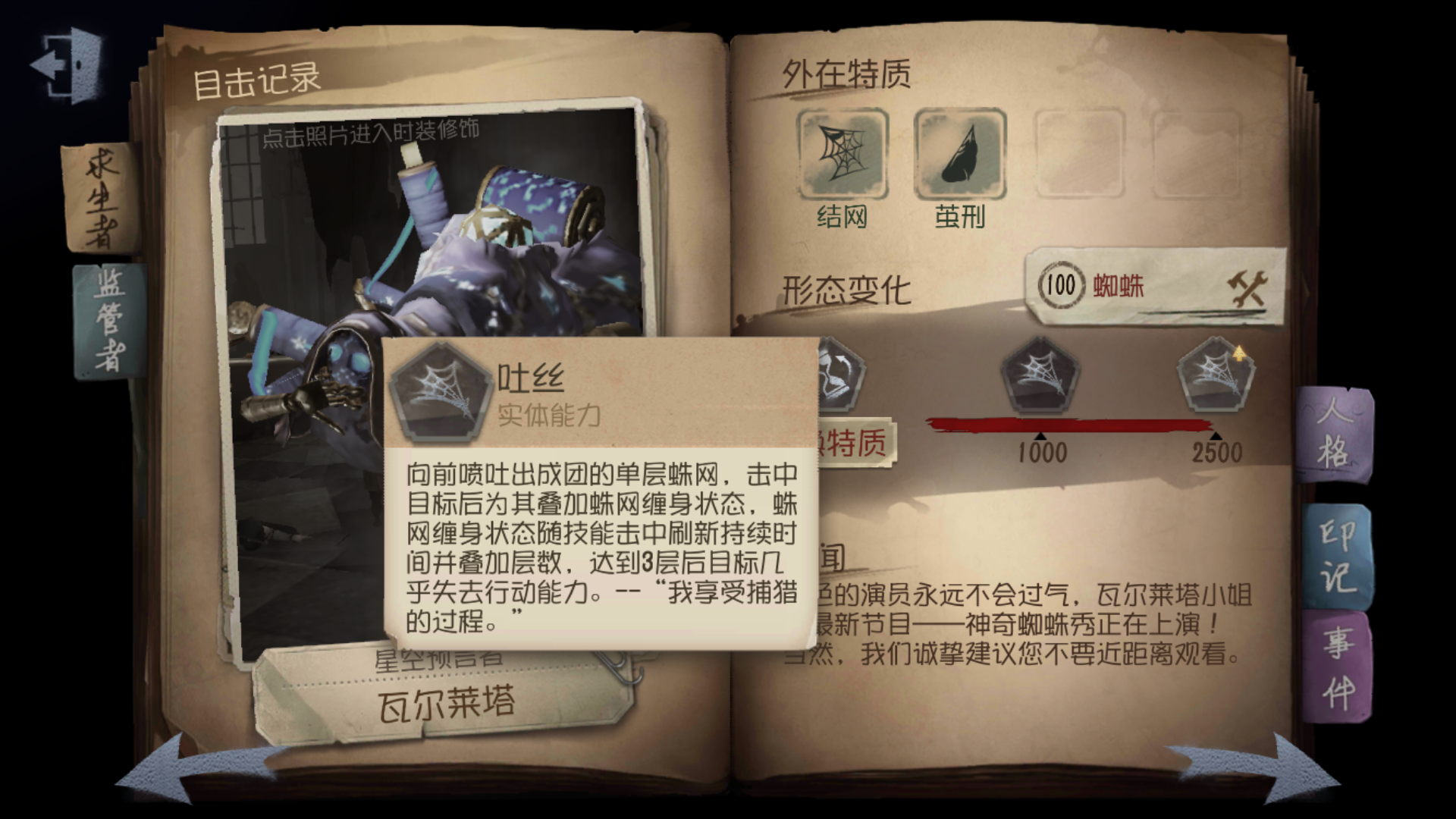 最近非常火爆的第三人称非对称性对抗竞技手游《第五人格》,相必各位大佬已经沉溺在游戏其中。对于现今这个版本有人说屠夫很强,有人说屠夫弱过头了。屠夫孰强孰弱想必各位算算在排位中等待的时间就知道了。。。(等待4分钟不见屠夫的应该不止我一个吧。。。),因为求生者等待的时间太长,所以近期都转战做屠皇(被遛的飞起)。。。,而这次就是玩这几把监管者的一点攻略,希望能够平衡下游戏阵容,给大家带来更好的游戏体验。 这次攻略是以蜘蛛为主的,所以先简单介绍下蜘蛛。 蜘蛛是4月中旬出的监管者,最大特色是吐丝、织网和结茧,大部分人害怕蜘蛛是因为她无视摇摇椅,直接结茧累计升天次数,其实蜘蛛真正可怕的在于织网和吐丝, 我们来看蜘蛛的技能: