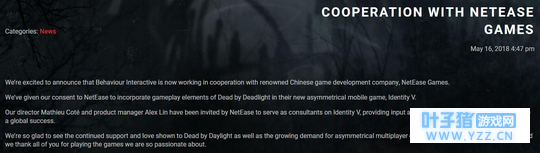 不过在《第五人格》上市不久,网易就发微博称《第五人格》取得了《黎明杀机》的授权的。而且《黎明杀机》的微博也发声明称授权《第五人格》在公测前可以使用其游戏的玩法。 不过昨天《黎明杀机》的开发商Behavior Interactive正式在其官网上发表声明称将开启和网易的合作,并授权网易在《第五人格》中使用《黎明杀机》的玩法。其文中称“我们的游戏总监Mathieu Coté和产品经理Alex Lin已经受邀前往网易作为《第五人格》的游戏顾问,并为游戏在全球范围内的成功提供建议。”
