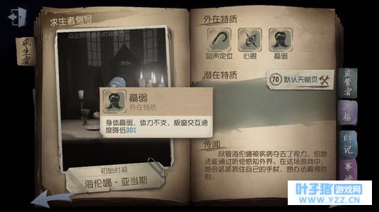 盲女 盲女也是有缺点的,首先是她的视野有限,只能显示周围有限的视野,这对地图不熟的小伙伴来说是个很头疼的问题,尤其是当密码都破解了,但是却找不到逃生的大门。还有就是他需要依靠手杖探路,所以盲女无法使用其他道具。还有一个弱点就是她外在特质羸弱,使她在爬窗翻版时并不比监管者快多少,所以就不要去没事找刺激跟监管者秀了。
