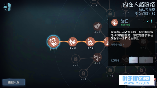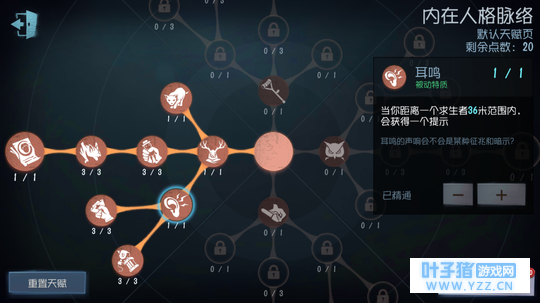 我找了半天,发现耳鸣的来源居然是个傀儡.jpg 狩鹿不用多说,方便放血党的,它的进阶技能耳鸣就厉害了,36米距离,小于四分之一个地图的区域但是也超大,可以模糊的判断这附近有没有人,同时这个距离也差不多是屠夫警戒半径的大小,耳鸣亮了后他必然会跑,一跑………就更容易被发现了。而且耳鸣还可以确定守尸时有没有人来救人,人在哪个门附近………神技,必点的那种。 剩下的就略略带一下子吧,清道夫恋物癖,一个显示在附近治疗的人另一个是减缓拆椅子速度……都没多少用,治疗的人一般都是离你十万八千里远才开始治疗,而拆椅子……其实只需要拆一片区域就可以,园丁现在一开始的速度别说降30%,降50%也是飞速啊=_= 追猎的移速加成看似诱人,其实……翻个窗踢个板就没了,不太适合和人皇互皮。 张狂线上的两个技能都是鸡肋,降低自疗上线的后遗症被人技能的自愈所克制,而负责降速的占有欲……你又不能在一个地方就那么站着看着他拆电机……… 6.封窗线