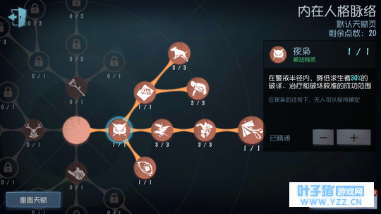 有一天,三慈善一冒险家的队伍中,屠夫走到了正在破电机的冒险家身旁…… 不得不说,有些时候废技能的路上却全都是宝,夜枭(夜宵)基本上就是属于为你强行崩爆米花做夜宵的一个技能,屠夫在附近的时候qte明显变短,一不小心就会炸机(炸鸡),挺不错,能起到干扰的作用。 报幕—恶犬—记恨 三个鸡翅,比鸡肋更好的技能,后两个是发现附近人用的,全点开后,极其不容易跟丢人,报幕则是给你一瞬间确定人位置的机会,判断他们要来哪扇门。 群鸦,好客之道这两个技能也是两个鸡翅,乌鸦报点很容易就能发现附近的人,而好客则能大幅提升抬人速度,间接的减小了挣脱的几率。 窥伺,我们不要提这个技能了,这个技能就像人那边的好奇心一样,绝对不要点。 可以说这条线除了通缉和窥伺都是比较好用的技能,主打发现敌人和跟踪敌人,但是对于那种追着你打手电根本不怕发现的人皇来说……没用。 9.一刀斩线