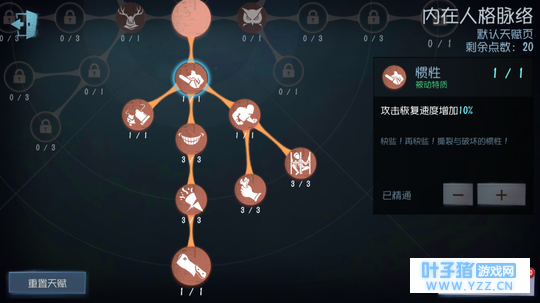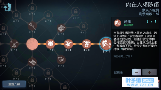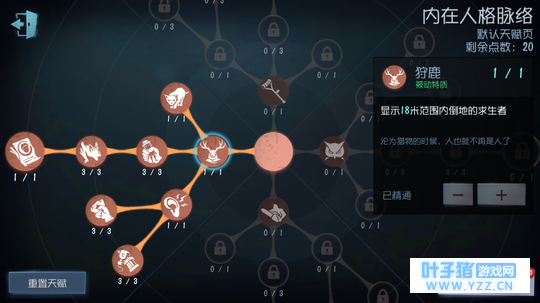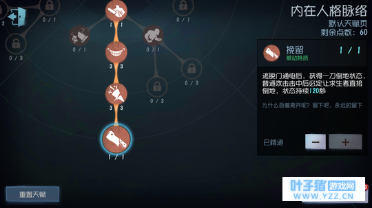 满血的你正在试图救人,这个时候,你的队友开了最后一台电机…… 挽留这个名字,听起来不怎么霸气,好像是屠夫在说:“咱们别打了,坐下喝口茶吃个包慢慢聊”什么的,然而给它的技能描述换个符合它的名字,那就不一样了…… 一刀斩! 众所周知,在游戏里处于交互状态(翻窗,翻板,开机,拆眼)的时候被打中是直接满血跪地的,而这个一刀斩,就是在电机全部开完后,获得不分青红皂白把人一巴掌拍晕过去的能力,简称LV.5打脸大法……这个技能和封窗一样同为神技,也被广大玩家评为翻盘神技,因为有很多厂长玩家前期遇到人皇一个人也挂不住,后期靠120秒的一刀斩,生生的给拖平了的缘故。 一刀斩适合的屠夫有厂长,杰克,红蝶,蜘蛛,鹿头和小丑这种技能有伤害的屠夫不太适合,它的时间是120秒,在这两分钟内,你需要使用传送等外在技能找到人然后能打多少是多少,挂上不要守尸继续去找下一个人,发挥一刀斩技能的最大限度。 好了,讲完了这四个顶点天赋,接下来,就要说说一些普通天赋了,有些天赋十分有用,甚至不弱于顶点天赋,合理用好它们,也能起到很大的辅助作用。 5.狩鹿线