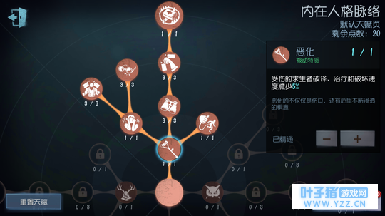 这招我们称之为:中了蛇毒 封窗线的技能就有用的多了,恶化是一个不错的技能,配合恐慌能大幅降低瘸腿人拆电机的速度,而恐慌的衍生:愤怒与狂暴一个是头铁,另一个是耍酷时间降低,学会自我约束不再自恋(厂长:嗯,我这鲨鱼长的真不错,哎呦人跑哪去了?),都很有用。 约束减少恐惧半径的……这个技能不推荐,因为有其他技能是在恐惧半径内怎么怎么样的,减少了恐惧半径就相当于削弱了这些技能,不太适合,不过红蝶可以点这个。美人相时加上这个技能可以神不知鬼不觉的接近人,然后突然窜过去吓他一跳! 封窗是神技,封窗线上的又是两个神技,踢板加速的破坏欲和俗称为“欧皇斩”的厄运震慑,踢板加速就不用说了,厄运震慑是20%几率触发一刀斩,运气好的话………可以在不守尸的时候瞬间打倒一个人,可以给你很大的惊喜(ಡωಡ)
