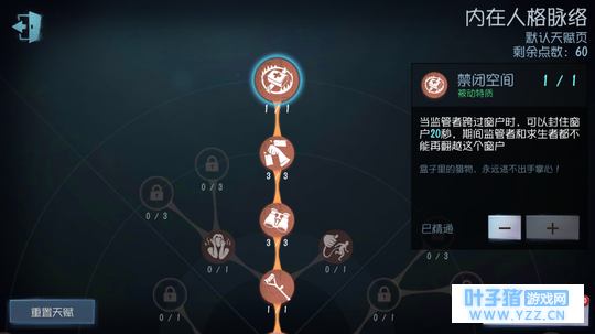 你以为我没有技能?突然掏出一个冲刺吓死你! 张狂天赋的描述是:游戏开始后一段时间内存在感持续增强,直到解锁技能为止,这个增强的速度很快,主要适合那种难以解锁技能且技能十分强势的屠夫。小丑和杰克就很适合,特别是杰克,杰克的手比其他人短,很难攻击到人。不点张狂有可能一局下来都无法隐身,没有隐身加速的杰克,盲女都能溜一阵子-_-|| 而小丑就是盯着火箭冲刺了,同样有冲刺和没冲刺的小丑是两个屠夫。现在小丑虽然可以通过开局捡小电驴的方式来开启技能,但是这样速度很慢,还消耗场上为数不多的电驴,而且就算这样的无限锯命中了一次,仍旧没有技能。用了张狂后可以无限锯后直接出技能,很管用。 2.禁闭空间