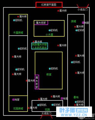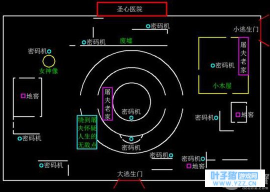 圣心医院两个大门前都有显著的建筑物标识,一个逃生门前正好面对的是医院阳台里的密码机刷新点,玩家可以在解完密码后直接爬窗直走,去开大门。