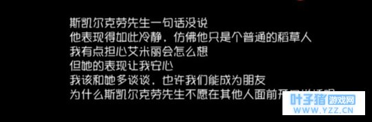 而就在谈话结束的时,慈善家的身影出现了。剧情接着往下走,日记二中园丁悄悄的跑到花园中想与稻草人对话,但是医生的出现这个愿望并没有实现。之后医生主动询问园丁关于稻草人的事情,园丁转移话题跟医生继续交谈并且建立了"深厚"的友谊。到了日记三园丁想去见医生,她认为这是她的天使。