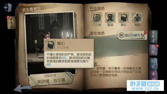 唯心: 不擅长使用科技产物,破译密码机的速度降低15%,破译密码机时触发校准的概率和校准难度提升50%。 解析: 跟佣兵和前锋一样属于文盲的角色,电机流这辈子都不可能带上她了,那个校准区域只有正常的50%,而且触发率还极高,如果队伍中有慈善家,屠夫又带了【夜枭】(在警戒半径内,降低求生者30%的破译、治疗和破坏校准的成功范围),那校准区域跟触发几率谁用谁知道。