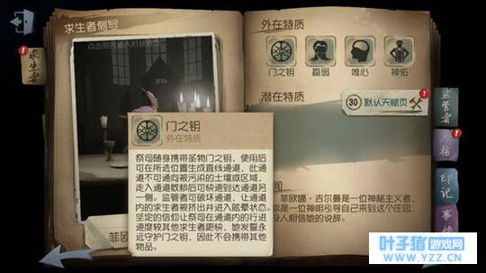 门之钥: 祭司携带圣物门之钥,使用后可在所选位置生成直线通道,此通道不可通向被污染的土壤或区域,走入通道数秒后可快速到达另一侧。监管者可破坏通道,让通道的求生者被挤出进入眩晕状态。祭司可以在通道内行进速度快于求生者,她发誓永远守护门之钥,因此不会携带其他物品。 解析: 1、祭司的技能使用次数跟屠夫的特质“窥视者”类似,初始是0次,随着时间的增加会累计获得使用次数(大概60秒获得1次),最多可积累3次技能。 2、通道不可通向被污染的土壤或区域的意思是不能穿过围墙/大门,所以那些指望祭司穿过大门,直接获胜的小伙伴们就不要再想了。 3、通道可以一直存在,不过监管者可以破坏通道,所以尽量不要找长板穿梭,否则在穿越的时候被屠夫一砍,就直接倒地了(类似恐惧震慑)。 4、不能携带其他的道具,类似盲女只能带盲杖。 被动技能 羸弱: 身体羸弱,体力不支,板窗交互速度降低20%。 解析: 这个技能决定了祭司不能用来溜屠夫,虽然可以穿墙,不过1分钟只能使用1次的技能,这期间靠板窗交互或直行的祭司够屠夫砍倒你几次了。