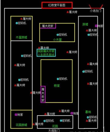 每个地图中都有无敌房和类似于无敌房性质的无敌区。 圣心医院在目前版本中算是最大的一张地图,这张地图的无敌点和其他两张地图不一样,医院的两个逃生门不是面对面的,木屋门也在一个小角落里。