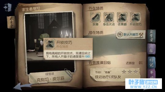 开锁技巧,慈善家的开锁技巧比较强,比其他的求生者快一倍,所以能快速的打开逃生门,帮助大家逃出去,所以在游戏里尽量让慈善家去开大门。 天赋加点推荐