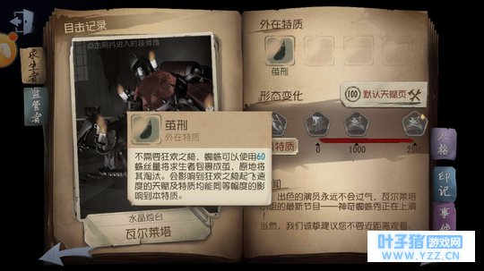 蜘蛛的技能如上,与其它监管者不同的是,她有一个技能蓝条,上限是200,而茧刑技能决定了园丁和前锋对她是无效的。而大多数蜘蛛都会布下天罗地网,等着下一个猎物,这个时候我们就要提另一个角色——机械师。 在蜘蛛的背景故事中,蜘蛛是由一位机械师改造而成,虽然没有说是不是小特,但机械师的娃娃可以很好的使她的蛛丝失效。 在茧刑中,求生者的死亡速度是比椅子上快的,这也说明了一旦有队友被裹粽子,你要把握时间,救人or修机。 关于技能吐球,这个问题就比较严重,一旦被蜘蛛减速到,你的板窗交互及移动速度都会受到影响。一般来讲,蜘蛛在靠近你都会给你叠上两层的debuff再来打你,这个时候如果你是健康的扯掉蛛丝就好,挨一刀无所谓的。 如果你已经半血,找板区或者窗户用来拖延时间(不建议窗户因为翻窗慢。) 在和蜘蛛平地跑的时候,一定不要呈直线型,最好s型,并且多听技能音效利用视角转换提前做好躲避措施。 蜘蛛一般都带封窗加一刀斩,这个时候我们在溜它的时候就要注意路线了。 当你踩到蛛丝时,不要躲在一旁,蜘蛛是可以看到你的。所以请各位萌新,要么跑要么扯蛛丝吧。 茧刑更新后,有独立的解救按键,不再是交互键,而是有一个独立的按键,注意哦。 做好上述这几点,轻松教你虐蜘蛛。 如果你喜欢这篇文章,请给作者推荐关注收藏,你的鼓励就是我最大的动力,谢谢