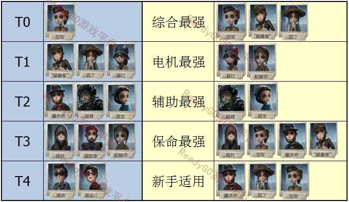 梯队注释—— T0:必带,版本天选 T1:极强的个人or团队配合能力,选了肯定不亏 T2:能力较为中庸,但不至于拖后腿 T3:短板明显,目前版本较为弱势 T4: 改善屠夫游戏体验 T0