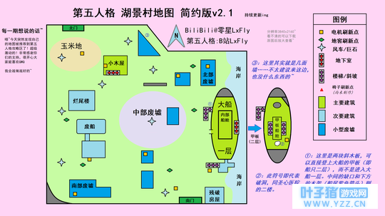 第五人格 湖景村地图 简约版v2.1 本次更新呢日本次更新内容:1.视图类: -调整了未来将会加入的狂欢之椅位置的图例。 -更改了部分文字的位置。 -改动了部分文字描述,删除/增加了部分位置的文字描述。 2.游戏类: -修正了大船的轮廓,加入了灰色区域代表障碍物。调整了箭头方向,使其上下更加明了~ -修正了地图轮廓。 -加了一面墙(雾) -调整了部分地窖/电机/障碍物的位置,更贴合游戏实际。