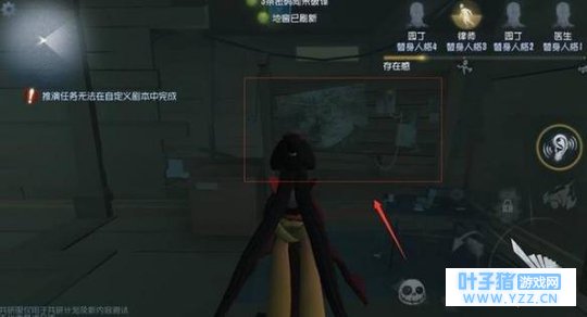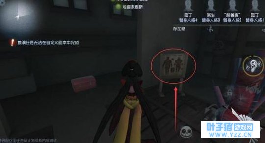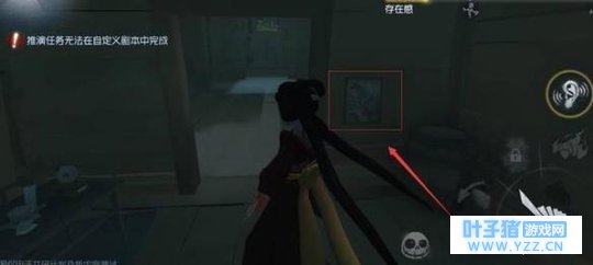 然后我们下到了地下室的二层,这里的摆设跟军工厂的vip房间是类似的,都是有4个椅子,但是唯一一个不同的地方就是在右边椅子上有一个告示板,上面是一个类似人形生物的图案,小编仔细的观察了一下,跟最早第五人格中曝光的一个人猿形状的监管者非常相似,不知道这个彩蛋是不是在暗指之前的监管者。