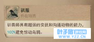 点此查看图片折叠原因驯服——驯兽师具有和动物沟通的能力,游戏里不会引来乌鸦。 这个被动就厉害了,很多玩家都被头上的乌鸦气到怀疑人生,这个被动使驯兽师躲藏能力大大增加。