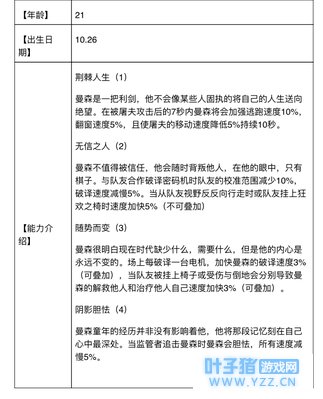 曼森童年的经历并非没有影响着他,他将那段记忆刻在自己心中最深处。当监管者追击曼森时曼森会胆怯,所有速度减慢5%。(心急,所以直接所有速度减慢5%,没时间写下去,当时凌晨三点hhhh)