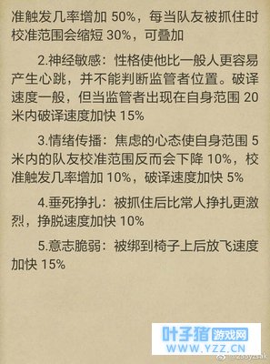 1.神经敏感(补充):当与受伤队友重逢时,会感到惊恐,焦虑和紧张感急剧上升。治疗和破译校准触发几率会提高20%,破译速度会提高15%,此技能不会叠加。 (即当有队友被抓住,身边队友又处于受伤状态时,会疯狂出现校准和爆米花,但同时破译速度会加快) ——当队友受伤时,救,还是不救? 2.垂死挣扎(技能补充) 由于经常被支使着去跑腿,所以移动速度比别人略快(不明显),但当监管者出现在自身10米范围内,跑动速度会加快15% ——没,没关系。。。我,我,我还可以跑,是的,我还可以跑!!奖,奖金我不要了!!我必须,要,要逃离这里!!我必须活下去!! 本文来源:bilibili,作者:我是你们的节操,转载请注明来源。 |