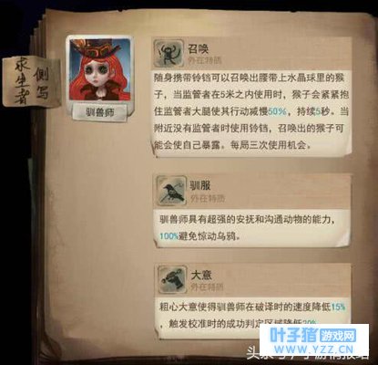 该画师还提供了像模像样的技能说明,可以看到驯兽师的招牌技能是召唤出一只小猴子抱住监管者大腿其行动速度,与目前已有的求生者技能没有重合,非常有创意。