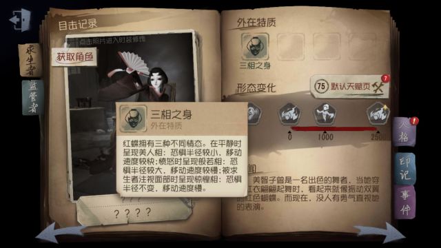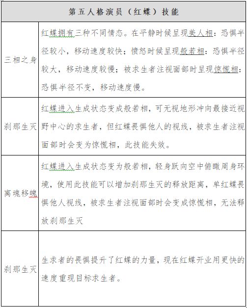 技能详解 【三相之身】 红蝶拥有三种不同情态。 在平静时候呈现美人相:恐惧半径较小(10米),移动速度较快; 愤怒时候呈现般若相:恐惧半径较大(30米),移动速度较慢; 被求生者注视面部时呈现惊慌相:恐惧半径不变(20米),移动速度慢。