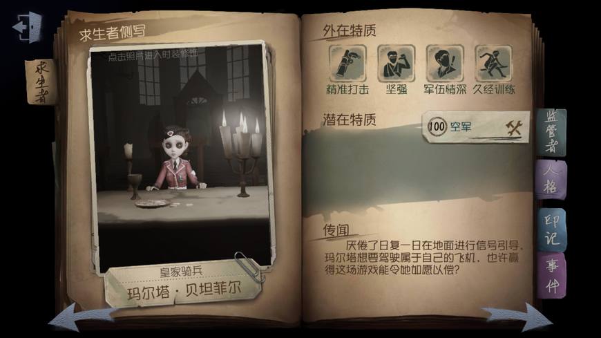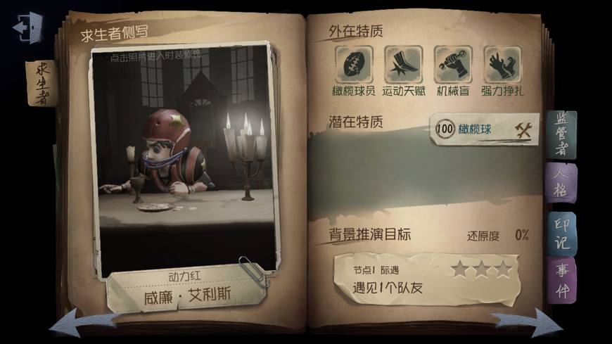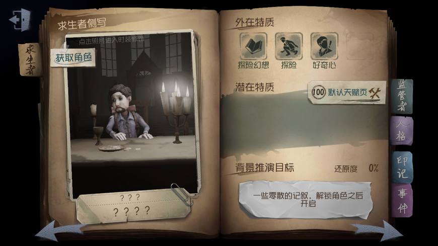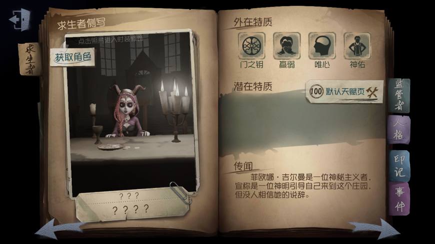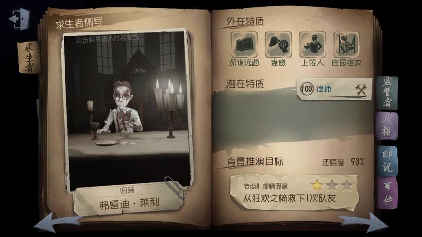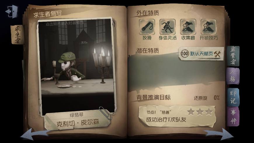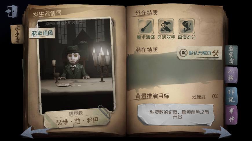 拥有的求生者为魔术师,一个“骗”子型技能,不过对于高手来说作用不是很大,可以通过地下的血迹来判断求生者的行走路线,是救队友时骗刀的好技能!