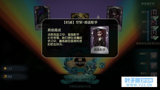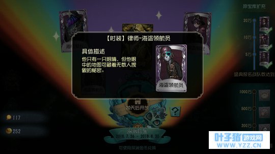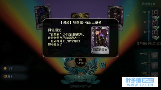 在7月5号,第五人格进行了一次维护更新,更新的主要内容为精华3调香师的开放以及深渊的呼唤第二章“新航路”。而随之也增加了几位角色的皮肤,多以“海洋”为题。 在深渊的呼唤里深渊珍宝可得知厂长、律师、园丁等角色出现了“海盗”系列的皮肤