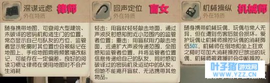 牵制型求生者特质 第二类:解密型求生者。这类求生者俗称机皇,用于加速开机完成整局游戏的胜利,在他们的眼里只有密码机,在能保证自身安全的情况下完成开机的任务。此类求生者有律师、盲女、机械师,他们的特质都有开机加成。