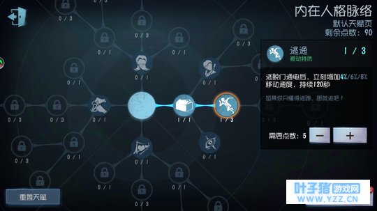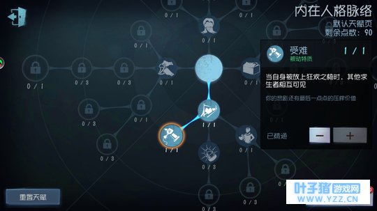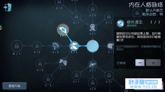 园丁 这套点适合园丁拆椅子,挣扎的快,爬的快,会让屠夫很恶心。被追了就往没有椅子的地方跑,被锤倒之后在屠夫擦刀的时间继续往没有椅子的方向爬,远离椅子,被抓起来牵气球的时候挣扎下来接着往回跑,只要不是蜘蛛,没带失常,基本可以这样玩好久。 有小伙伴会发现,我上面的截图都是没有把100点人格用光的,因为支线天赋有的很有用,有的没啥用,具体得根据你们自己的玩法习惯来点,我为大家推荐几个比较有用的支线天赋。 1,绝处逢生