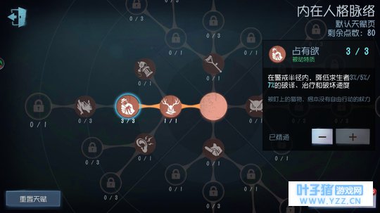 挽留+通缉 5,鹿头... 鹿头啊..我是真的不知道怎么点才好,怕误导大家就不多说了,不过鹿头也是特别吃技能的角色,所以张狂应该要点的,而有钩子的鹿头可以勾到窗子里面的人,所以封窗的实用性就变小了,二阶钩勾过来锤一下直接秒人,所以一刀斩的实用性也小了,大家根据自己喜好点吧。 求生者如何判断监管者天赋由于求生者是被动的一方,所以如果能尽快的得知屠夫带的是什么天赋,对于人类来说才能更好的应对。比如如果知道屠夫带了封窗,在翻窗之后的路线选择就要更慎重,带了一刀斩就不要盲目救人等。 监管者和求生者不同的是,屠夫没有说一定有哪个是必点的,根据每个角色不同的特性来看哪个更适合,所以根据上述推荐的屠夫加点,可以在遇到这个屠夫的时候就在心里默认的给他定义成他就是这样点的,从而判断他的一些套路打法。 比如遇到的是杰克,就默认他为张狂一刀斩,要是发现他没有张狂,那就可能是封窗一刀斩,按照这种思路来整理和排除。 先排除右边通缉这个天赋,因为虽然之前文章中提到过这个天赋的一些玩法,但相比其他3个主线天赋,这个略显逊色,如果你抓到人之后去追被通缉的人,追到了还好,如果没抓到,之前抓的也被救走了,得不偿失,所以通缉的实用性和容错率更低,也就姑且排除了屠夫点这个天赋的可能。 排除了通缉,再加上开门保底的挽留,确定了一个不点的,和一个必点的,判断屠夫其他天赋的关键点就在这个 占有欲 上