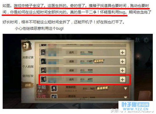 下面我们先看玩家怎么说的:游戏中椅子全被拆,而且是非常快速。甚至可以排除“压椅子”的的因素,因为短时间场内清光椅是可能再能“压住”的,这样耗费的时间要比原本大的多。所以这名玩家严重怀疑是有恶意利用BUG的行为,也就是说《第五人格》比赛中这名行为诡异医生有问题。抱着这样疑问玩家还有很多,下面我们谈谈它到底怎么回事!