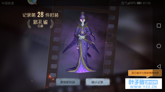 第35件时装,当初抽到红蝶的紫孔雀好像是第28件。看来,抽出紫皮的概率还是蛮大的。