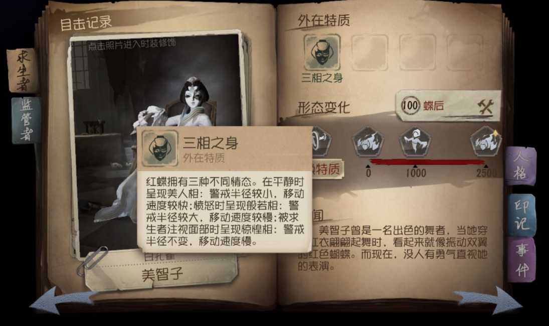 红蝶在正常情况(美人相)下,移动速度是所有屠夫中最快的(不算技能加速)。再加上她开局的技能,这使得红蝶前期(前60秒)抓人效率高过一切屠夫。但是,想必大家一定清楚红蝶的刀(诡异的一批的指甲刀)。红蝶的刀很短可能会空刀一万年(适应就好了),其他的低端局还能玩玩,等你上了高端局会发现除了红蝶小丑其他的都很难上(不包括厂长,不知道现在厂长到底能不能上高端局)!