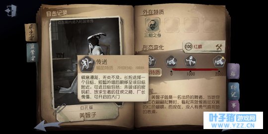 红蝶天赋 一点“约束”加上红蝶的“美人像”可以十分的靠近求生者没有心跳预警 点满“厄运震慑”远距离拦截空军救人 两点“拘禁狂”更快的过半血 “挽留”逆风翻盘的核心天赋 2.辅助特质