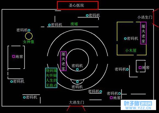 1.熟悉地图大致结构(无敌房位置这个很重要,新手不懂无敌房的我待会儿说的)、各人类各监管者的技能。 2.探索地图靠最外围的墙走时视野最开阔,听到有心跳声先躲在掩体后确定监管大致方向; 3.开局直接修电机,但注意尽量找个旁边有板子或窗户的电机,这个时候监管一般都会往电机的方向去找目标; 4.每在一个新点位修电机的时候都可以边修边快速注意下周围的情况,在心中制定一条躲监管的完美逃跑路线; 5.优先开地图中央的电机,这样的话监管想要在剩下的电机间巡逻就要走很远的路。每碰到一个电机后可以修一点点(让电机发出声音)来迷惑监管,迫使他在电机旁浪费时间巡逻; 6.电机爆米花了不要立刻就跑,看情况继续修(新手不确定的话可以带炸机显示监管者位置或者炸机不被发现的天赋); 7.如果监管来,第一时间确定一下他发现你没有,目标是否是你,如果不是,不要乱动。好好蹲着卡视角也是很好的; 8.如果屠夫的目标是你,那么迅速开始跑,沿着之前制定好的方案。如果你附近有队友且你又受伤了,立刻往队友旁边跑,如果你没有受伤可以选择避开队友的方向,拖延时间让他继续修电机; 9.面对监管追杀时尽量不要跑直线!不要躲柜子; 10.不要乱翻板,每一个板子都是珍贵的资源,但是也不要贪板,该放就放; 11.如果监管对你穷追不舍,那么请边绕边往无敌房跑,之前说的让你们记住无敌房的位置就是因为这个; 12.自己被砍趴,监管走开时不要乱爬,自疗就可以了,等待队友救援; 13.队友被挂,看情况决定救不救,监管守尸的话不要乱救!救下来后他跑不掉就等于在加速他死亡(坐椅子也有进度条,刚放上去没过半救下来再被挂上就从一半开始,如果到一半或者超过一半救下来再被挂的话就直接死了,所以可以卡一下时间快到一半再救人),救人下来后满血的话替他抗一刀; 14.电机都修好后 一般监管会去最后一个亮起的发电机旁边那个门(一般监管者都会带一刀斩,开完门后没把握就不要救人了); 15.靠近开启的地窖时会有持续的“嗡”声,根据声音自己找到地窖吧! 16.如果监管追杀你周围又没有什么可以翻越的东西,而且监管已经离你非常近了,跑直线!感觉下一秒就要中刀的时候(控制好时间)立刻反方向拖动操纵杆!反向跑往背后跑,这时候有一定几率会让监管打空一刀,趁这两秒钟的时间迅速拉开距离往板子或窗户方向跑; 17.修电机的时候注意力集中,右手拇指离屏幕距离最佳3~5mm左右,qte的范围和频率不同的角色也不一样; 18.监管用技能聆听的时候走或者蹲着移动是不会被发现的。(聆听可以直接发现变小的冒险家) 什么是无敌房:其实无敌房并不是真正的无敌,无敌房其实就是普通的房子,因为窗户比较多,可以更好的溜屠夫的地方统称为无敌房。还有一些类似无敌房的地方,就是窗户板子很多的地方,比如医院废墟,可以加以利用来绕屠夫给队友争取时间。 关于地窖:地窖是人类可以直接逃出地图的通道,修复两个电机后地窖就会刷新,当人类阵营只剩下一个人时地窖就会开启。不过地窖刷新的位置有三个(湖景村五个),需要我们自己在游戏中去寻找。 乌鸦:乌鸦在游戏中是监管者的伙伴,求生者惊动或者长时间不活动,乌鸦就会为监管者提示求生者的位置。乌鸦有地图上的和求生者头上出现的两种。地图上的只有跑动模式会惊动乌鸦,走动和蹲行都不会惊动乌鸦。 乌鸦出现在头上是因为人类玩家很久没有活动,这个具体时间经过测算是75秒,所以人类玩家在游戏过程中,一定要注意这一点。当然有的玩家为了牵制屠夫,给队友拖延时间,会故意吸引乌鸦报点,这个就另当别论了。 游戏平面图:(只看地图可能看不懂,多玩玩就记住了)