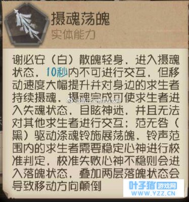 这个技能名字叫做吸欧气和摇铃铛 第二个技能,我认为便是花拳绣腿了。摄魂状态见视频上面好像是说距离远一点的话效果会很不好,估计官方会做出摄魂距离方面的调整,不过,摄魂成功之后, 貌似也不能保证人类会倒吧。算得上是干扰,并不是像黄衣一样的直伤,个人理解,认为有点鸡肋。