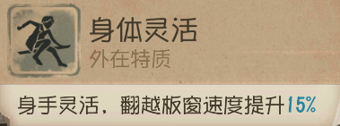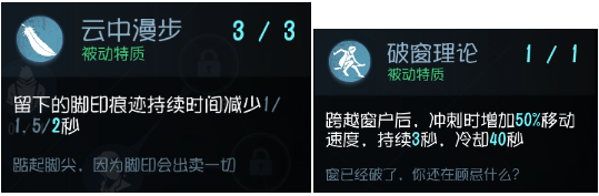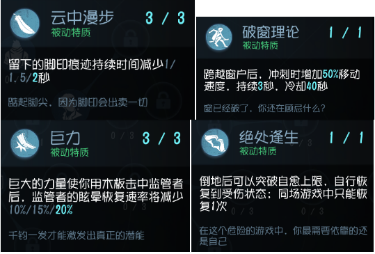 角色特质 1. 狡猾:开局自带手电筒。 2. 身体灵活:增加板窗交互速度。 3. 收集癖:增加校准几率,减少校准范围。 4. 开锁技巧:提升开箱子的速度。 从特质来看,这个角色是没有任何缺点的,当然有人会说收集癖就是缺点,但是我认为,这绝对是个优点,因为在完美校准的时候是可以增加破译条的,所以这根本就是个没有缺点的角色。 天赋分析 慈善家主要以救人和对抗加法为主,勇敢点出巨力和破窗理论,还有绝处逢生,之后再点出云中漫步,加完这些,就没剩几点了,但这些都是要优先点出了,后期升级再获得,再加其他的。