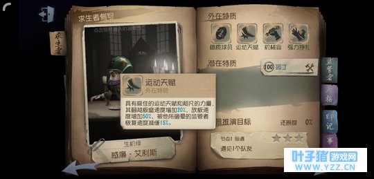 运动天赋 翻窗翻板速度加快百分之二十,几乎不用担心被震慑。放板速度增加百分之五十,更有效率得砸晕监管者。自带百分之十五的巨力,配合巨力人格点,使监管者眩晕更长时间,被前锋拍一板,绝对不好受。