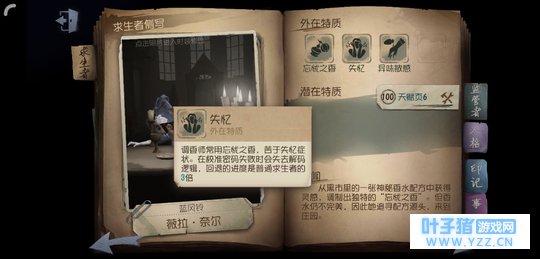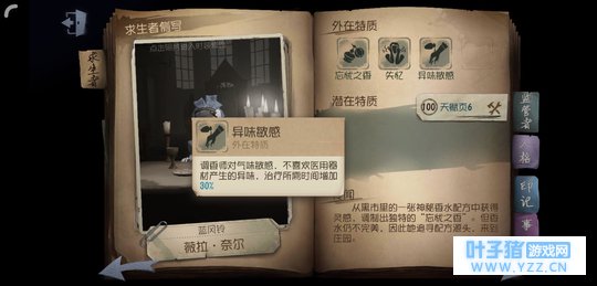 忘忧之香 等同于制造一个可以时间倒流的分身。“忘忧之香”,香水师起始有三个香水瓶,使用技能后,再次使用可回复之前的状态。这也是调香师的主要技能。当调香师使用技能期间,在被监管者击中,导致半血状态时,在技能还未CD前再次使用技能,可回复至之前的满血状态,而倒地后则无法回复至半血状态,所以满血的香水师对于监管者来说才是最可怕的。因为三个香水瓶可以使用三次,也就是说,如果香水师够秀,那么,香水师在吃五刀后才会倒地,比魔术师还要多出那么一刀。同时,释放香水的时机和回复的时间也很讲究,在即将被砍一刀时使用香水,砍中后马上回复,因为回复至之前状态与位置后,会有短暂的后摇,这也是监管者能抓住机会砍到你的时机,同时,也要准确把握,监管者会在什么时候砍你,在攻击范围内的时候,马上使用香水,或者听到监管者出刀的声音的那一瞬间,使用香水,全凭你的感觉和经验使之变成一个主动的求生者。让监管者后悔去追你。而香水师的主场也是在板区,和魔术师的定位相同,如果你担心被抽板刀,又想砸晕监管者,可以在监管者接近时,使用香水,待其出刀后,将板子砸下,如果被抽刀,使用香水也能回复。在医院或者湖景村二楼的洞或者是往下跳的地方,使用香水,让监管者由于是否等待技能过去,还是继续追击。利用监管者犹豫的时间,逃离,或者监管者继续追击你,则利用香水回到原来的二楼,浪费监管者时间,为队友争取宝贵的修机时间。 香水师该技能的缺点在于能为监管者刷存在感。如果五刀打中后,调香师倒地,那么,对于例如小丑,杰克这些依靠存在感来获取技能的监管者来说,直接出二阶技能,无疑是非常有利的。